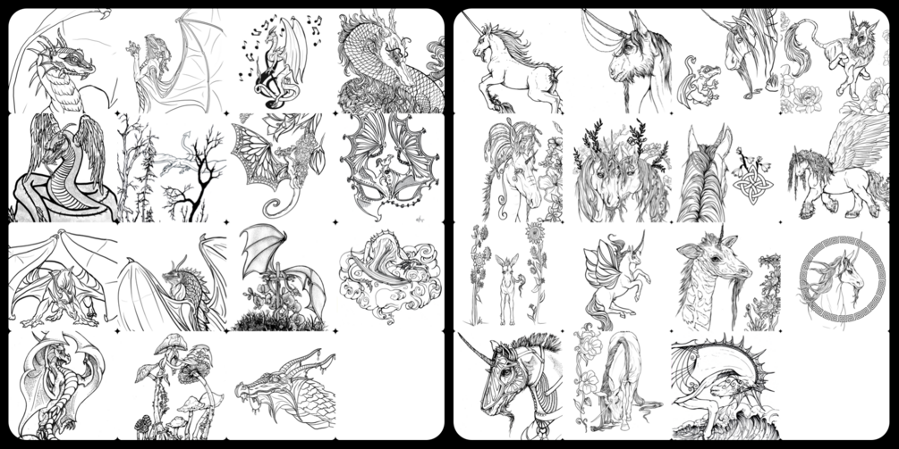 DIGITAL DOWNLOAD ‘Unicorns and Dragons, Plus their cousins’ Fantasy Coloring Book Pages. Thirty fantastical coloring pages to inspire your imagination.